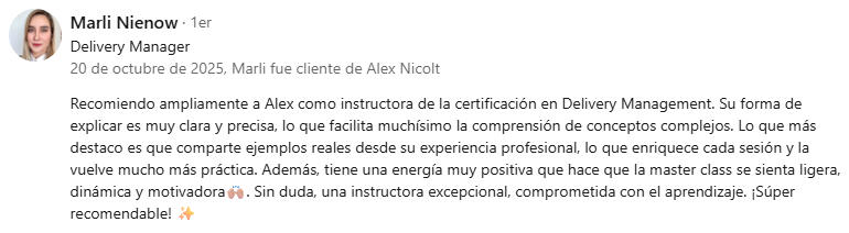 1. Intro: Product-Led, Project-Led y Delivery Led:Primero nos enfocamos en introducir los conceptos de enfoques Product-Led, Project-Led y Delivery-Led, explicando sus diferencias y aplicaciones REALES. Los participantes aprenderán cómo cada enfoque influye en la toma de decisiones y en la entrega de valor. Se explorarán ejemplos prácticos y se proporcionarán herramientas para implementar cada enfoque de manera efectiva, asegurando la entrega continua de valor y la adaptación a entornos cambiantes.2. Módulo 1: Entregas e Incrementos de Valor:Este módulo introduce a los participantes en la entrega e incrementos en entornos complejos y cambiantes. Aprenderán sobre los diferentes modos de entrega, cómo aplicarlos y cómo la agilidad impacta el flujo de valor. Explorarán conceptos como anti-fragilidad y modelos de complejidad, además de las adaptaciones necesarias en los procesos de gestión para habilitar una entrega ágil y efectiva.3. Módulo 2: Gestión del Sistema y Empoderamiento del Equipo:En este módulo, los participantes se centrarán en la optimización del sistema para apoyar el Delivery. Se explorarán métricas relevantes para la optimización del sistema, la identificación de dependencias y bloqueos, y la importancia de la gobernanza y el Gatekeeping en el Delivery Management. Además, se abordarán estrategias para crear un entorno de equipo seguro, fomentar la responsabilidad del equipo y liderar con el ejemplo.4. Módulo 3: Entrega Continua de Valor:Este módulo se enfoca en la identificación y comunicación del valor, la definición de una entrega exitosa y el aprovechamiento de la incertidumbre. Los participantes aprenderán estrategias para optimizar el sistema completo en lugar de soluciones locales.5. Módulo 4: Planificación y Monitoreo Adaptativos:En este módulo, llevaremos el Delivery Management de la teoría a la realidad.